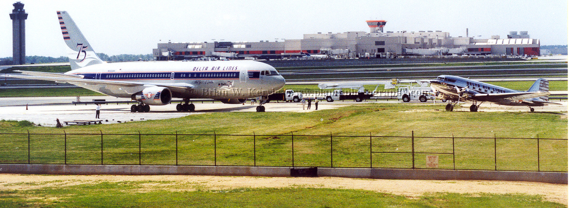 | I attended my first shareholder's meeting on April 23, 2004 It just so happend that it was for Delta Air Lines, in Atlanta, at a hotel adjacent to the airport where they had Ship 102 and Ship 41 on display. Ship 102 has been painted in 75th Anniversary livery. It is the 767-232 which the employees purchased for the company in the early 80s. Ship 41 is the original DC-3 that the company owned. |